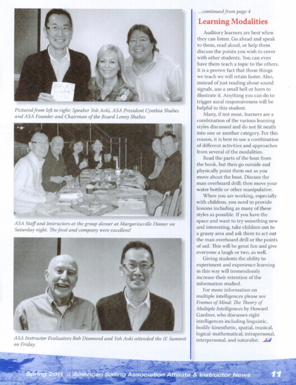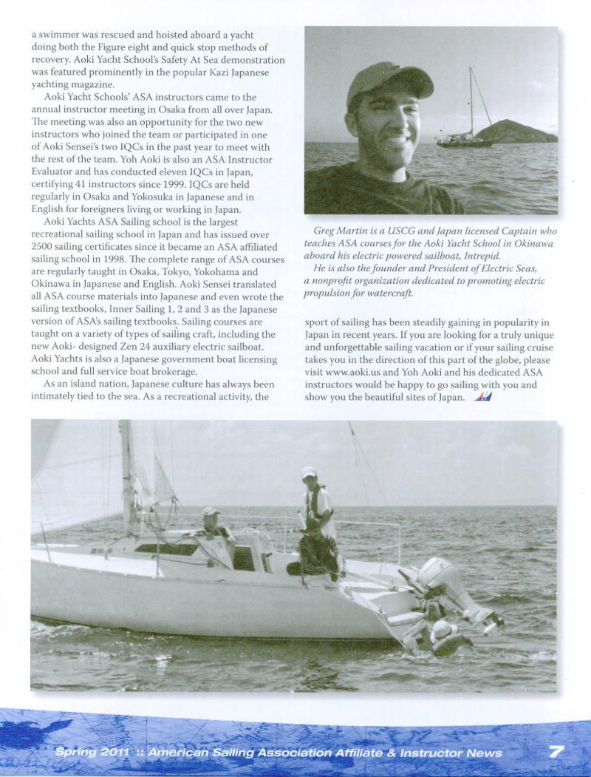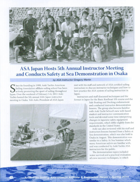 世界各国で82万以上のヨットライセンスを発行している世界最大の組織、アメリカセーリング協会(ASA)の小冊子“ASA BEARINGS” 2011年春号に、青木ヨット関連記事が大きく掲載されました。 ■落水者救助研修会レポート(沖縄校:グレッグインストラクター) ■ASA全米会議(青木ヨットスクール:校長青木洋スピーチ)