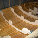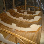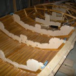 AH15のバウデッキは、バウポールを装備できるよう凹型の溝をもうけます。溝はデッキの剛性アップの役割を担います。従って木造艇のように、ビームをデッキの裏側へ設置する必要はありません。