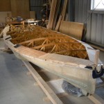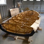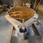 積層が終了したFRP型を反転して、正立させた。その後FRP型の内部に、デッキを形成するための木型を作り付ける。