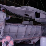 AH24は使用するポリエステル樹脂とガラス繊維の構成が、定められている。設計図と仕様書に忠実に施工するのであるが、常に重量と強度のバランスを図らねばならないので、現場の工夫が欠かせない。
