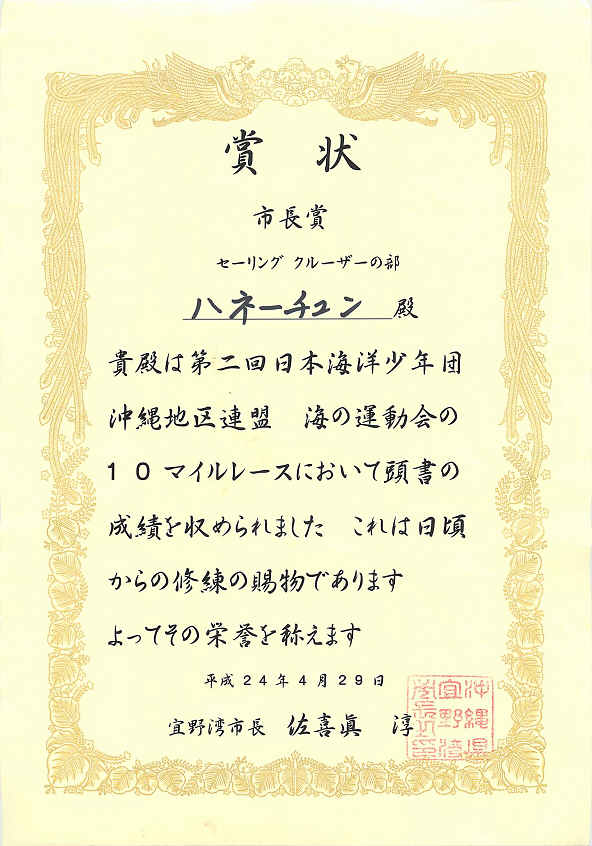 昨年から係留先の宜野湾マリーナで開催されているヨットレースで、なんと!2連覇されたそうです!!