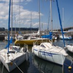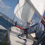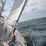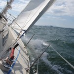 関西の天気は晴れ。当日の潮流、風向風速等を確認し当日の有利なコース取りについてミーティングを行い出港。 参加者の方の顔が日焼けで真っ赤になるまでセーリング実習を行いました。