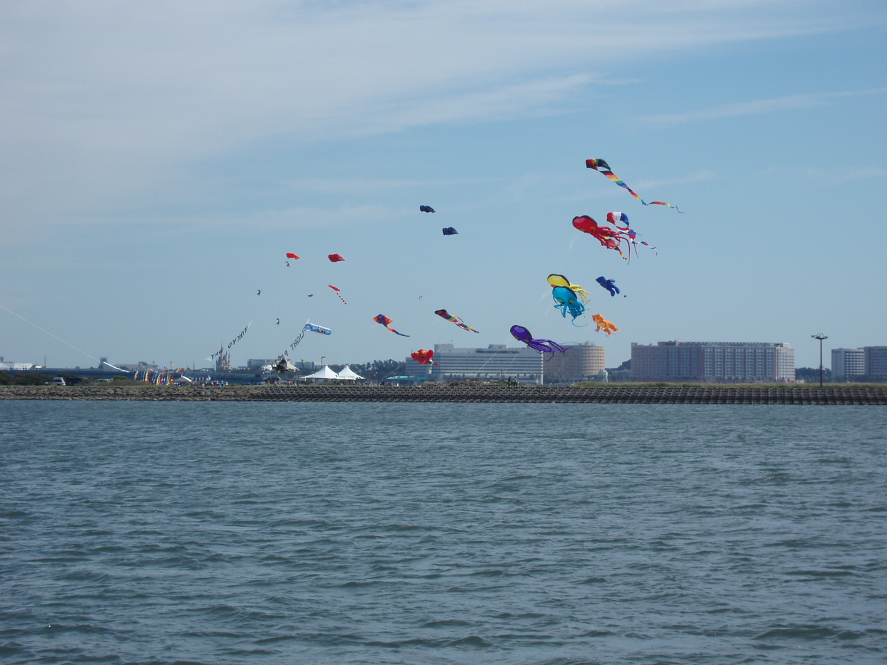 東京校の夢の島マリーナを出港して、荒川を下ると、左岸に葛西臨海公園があります。 10月13日の秋晴れの空には、タコの凧揚げをしていました。 (あ)