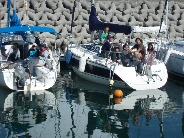 田尻ヨットレース当日、参加者の皆様は早くから集まり出艇準備。前日からいらっしゃって船中泊している方も!皆様気合十分です!