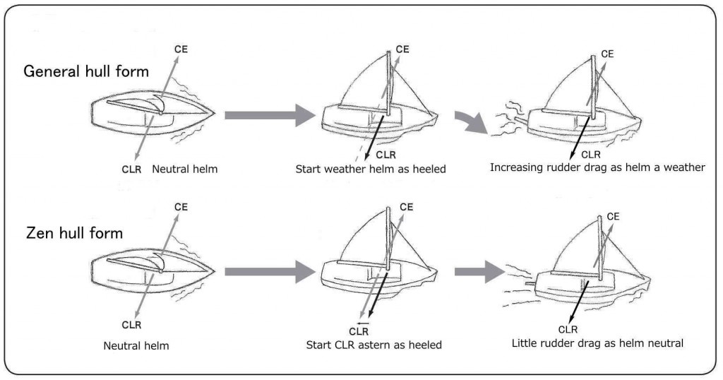下の図をご覧下さい。通常のヨットでは、風を受けてハルがヒールすると 、CLRとバランスしていたCEが、後方へ移るために、ウエザーヘルムが発生します。するとヨットを直進させるために、ヘルムスマンは舵を切らねばなりません。舵を切ると大きな抵抗が生じるので、ヨットにブレーキをかける状態となります。