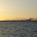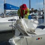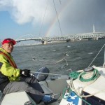 天気は晴れ。風はN-5m/s。天気が良かったので、予習問題の解説は艇上で行ないました。疑問に思ったことをその場で確かめられるのが好都合ですね。出港すると、艇を荒川から海に押し出す北風が吹いています。 早目のセールアップ作業をしていると、突風に襲われ、微かに雨粒が頬を叩きました。雨雲が頭上をかすめていったのです。 「あの雲の風ですね。」と振り返ると、そこには虹がかかっていました。各風位での帆走やタッキング・ジャイビング、8の字救助法を練習しました。
