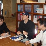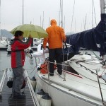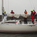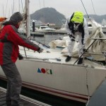 まずはインストラクター同席のもと、練習メニューの確認、海域情報の確認、ポジションの確認、天候情報の確認、出港手続きの確認をしました。その後コンドル号に移動して出港準備を済ませ、11時頃にヴェラシスを出港。雨が降る中、セールアップ後は南方位浮標を中心にソーセージコースでタッキングとジャイビングの練習。30分おきにポジションを交代。午後から風速が上がり始め、ヒール角が30度に。7〜8m吹いたところで#1からレギュラーにセールチェンジ。その後も風速は上がり続け、10m吹いたところでワンポンリーフ。最大風速は13m。全員がすべてのポジションを経験したところで帰港し、ディスカッションを行いました。