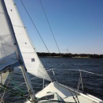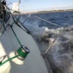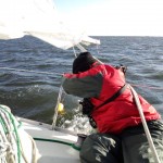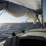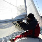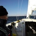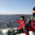 天気は 晴れ。風はNW-7~NNW14m/s。午後から強めの風の予報、予習問題の残りとセーリングでの8の字救助法の説明をしてから出港準備を行いました。出港しレギュラージブとフルメインでセーリング開始しましたが、ブローでガンネルが水をすくうようになった時点でメインをワンポイントリーフにしてヒーブツーの練習、お昼はヒーブツーで海上で昼食休憩を行いました。午後から練習を再開し8の字救助法の練習、途中風が強まりツーポイントリーフにしました。予報どおり北風がさらに強まりオーバーヒールするのでジブはストームにチェンジしました。はじめは強風に顔が強張っていましたが、ストーム+ツーポンにしてからはそれなりにヒールはするもののウェザーヘルムも少なくなり表情や会話に余裕が見られるようになりました。