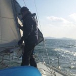 海上実習を始めるころには風が強まり、波も立ってきました。帆走を開始し、各風位での艇の状態を確かめます。 ヒールして飛沫を被ってしまう角度、追い波で不安定になってしまう角度、風を強く感じたり弱く感じる角度などを体験しました。 さらには、休憩を兼ねたヒーブツーで明日の「8の字救助法」に備えました。