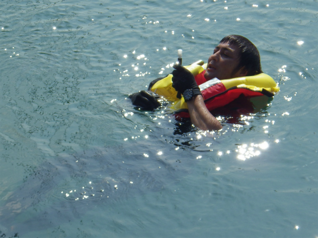 また、実際に水面へ落水しての、ライフジャケットなどの実演も行って頂きました。