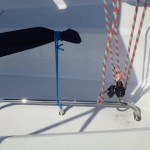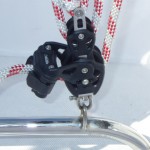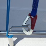フットレールのマウント部は、コクピットフロアーへ貫通ボルトを使用して、固定しています。フットレールの上部には、セイフティライン用のハーネスホルダーと、メインシートのブロック取付けアイを設置しました。ハーネスホルダーが中央にあるため、タック時にセイフティラインのフックを取付け直す必要がありません。写真のセイフティラインはオプション装備です。