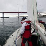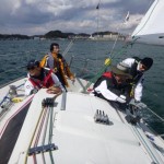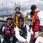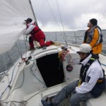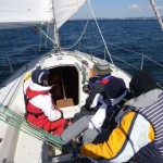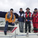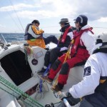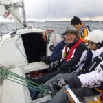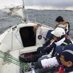 快晴に恵まれ、ニコニコで出港しました。黒い雲が出てきて、強風と波のため、縮帆で対応です。