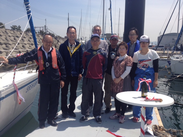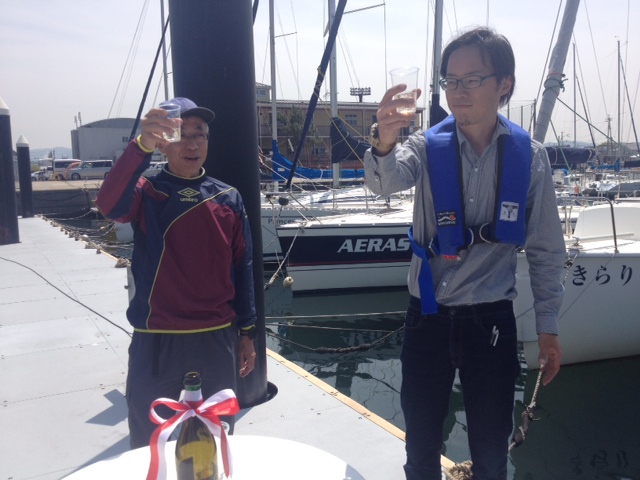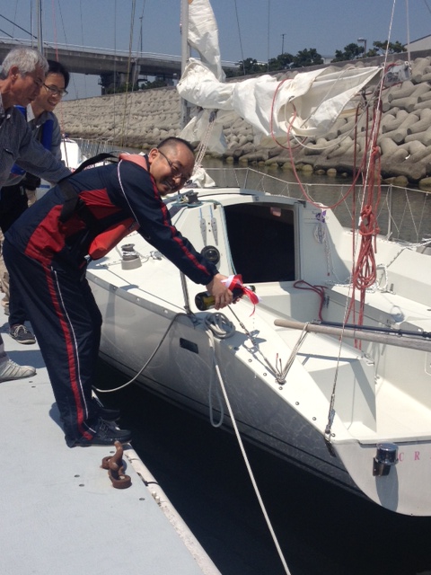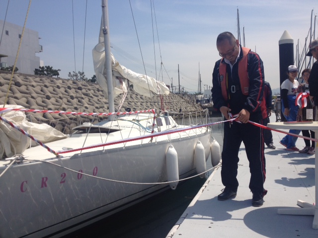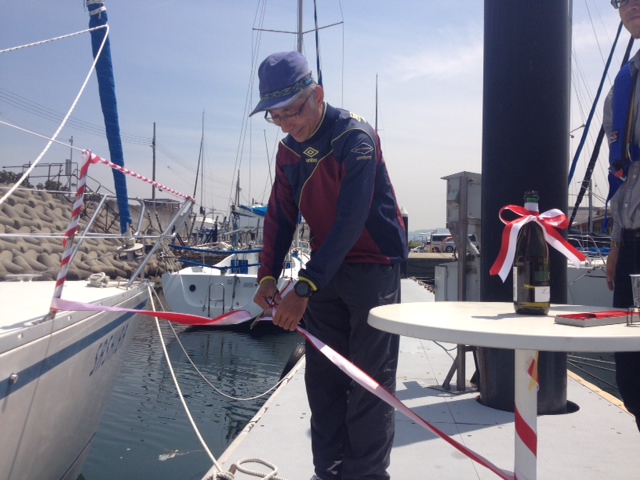 青木ヨット青木洋より挨拶、オーナー様よりひとこと、安全祈願(船首、船尾にワインをかけて安全を祈願します)、乾杯、テープカット、記念撮影と、本格的!
