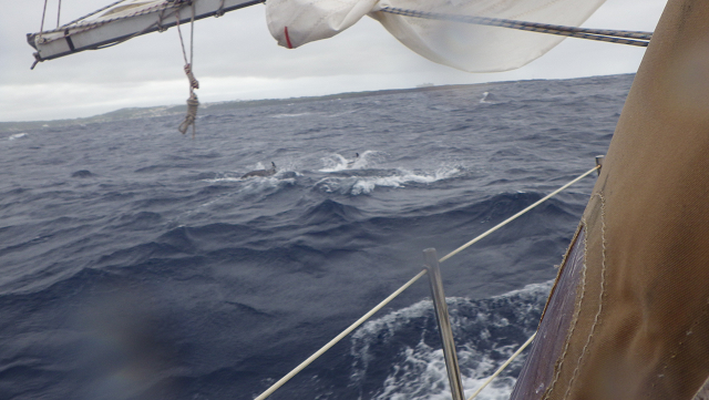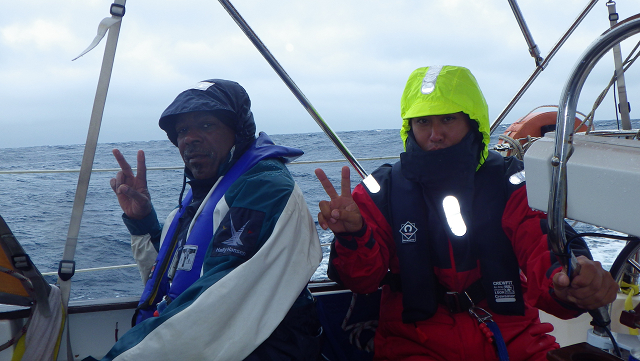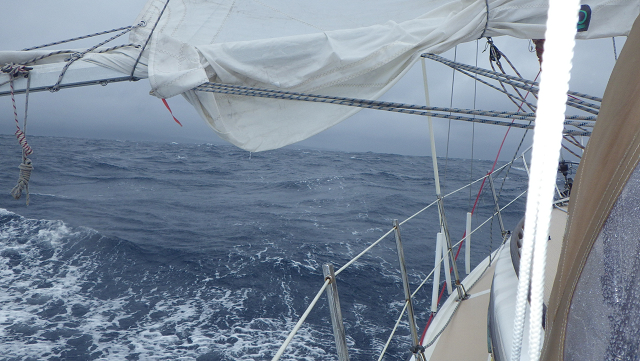 雨と突風の中、いきなりメインを2ポイントする。1ポイントリーフでは、エリアが大きすぎて間に合わない。2ポイントリーフしてたメインだけで、5ノット以上でセーリングする。ランニングなので、波に乗ると8ノット以上になる。波高は5mを越えている。