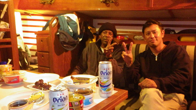 宜野湾マリーナへは、計画よりは2日早く入港する。缶ビールと缶詰を開け、3人でささやかに無事到着を祝う。