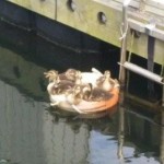 カルガモ兄弟も台風避航?(救命浮環でプカプカ)