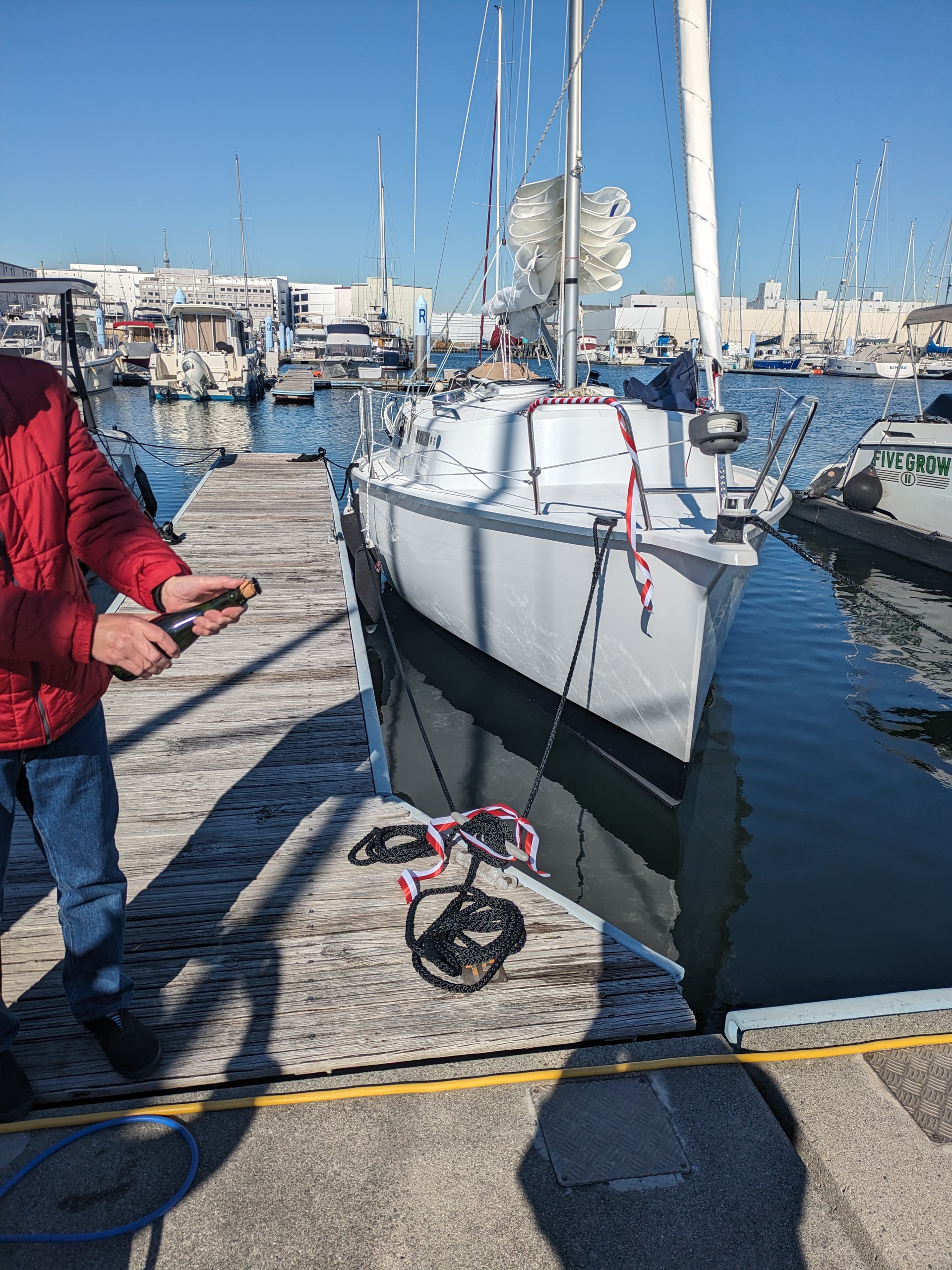 Iさんが待ちわびたZen-24(新艇)が、東京の海にやって来ました。ささやかな進水式を執り行い、早速出港です。快晴、ヒンヤリ爽風10kt、ご機嫌な初セイリングを味わいました。これから、もっともっと楽しんでくださいね~! (あ)