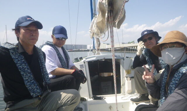 4月の練習テーマは、「スピンネーカー」です。9日の平日コースには4名、12日には7名のメンバーが出席しました。イメージのなかにあるヨットは、三角形の帆が2枚ある姿だと思います。そして、実はもう1枚の帆「スピンネーカー」を使うと、追い風での帆走スピードを高めることができるのです。でも、操作するのには少々訓練が必要になります。先ずは、桟橋に係留した状態で、準備と操作を実践してみました。 (あ)