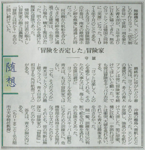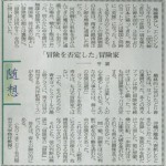 2010年7月2日、神戸新聞(夕刊) 随想『「冒険を否定した」冒険家』(守誠=名古屋市立大学)に青木洋が紹介されました。是非ご覧下さい。