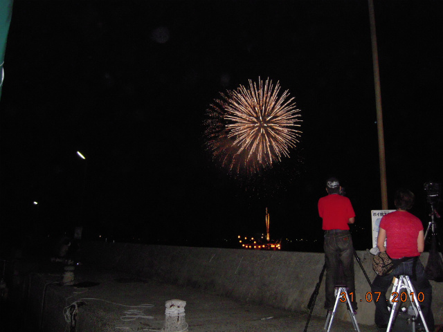 (花火大会の日に入港 上関海峡に浮かべた台舟からで 防波堤は特等席)
