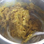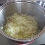 - 赤唐辛子、ニンニク一玉、ショウガひとかけと玉ねぎ3個を薄切りにして、オリーブオイルで炒める。