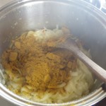 - 玉ねぎが透明になったら、カレーパウダーをたっぷり入れて炒める。