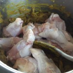 - 良い香りがしてきたら、チキン手羽、大切りにしたもも肉と胸肉を入れて、炒める。