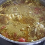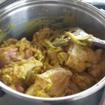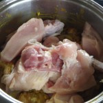 - 鶏肉の表面が白くなれば、2,3カップの水を入れて煮る。