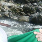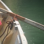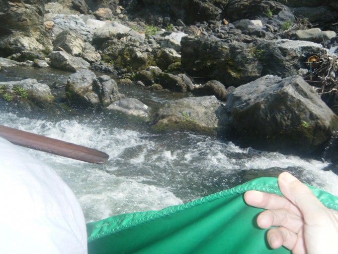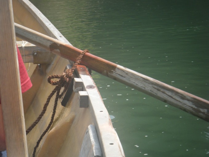 推進力は竹竿が一人に、櫂が一人だ。櫂はねりがいと同じ形状で、持ち手はT型になっている。ガンネルに棕櫚縄で巻きつけた櫂を、オールの動きで力いっぱい漕いでいる。摩擦で焼け付く棕櫚縄に、時折水をかけている。艇速を水流より速く保たないと、梶が効かないからだ。水流に乗せているだけでは、岩に激突する。岩角には10㎝ほどに迫るが、実に巧みな梶さばきだ。ヘルムスマンは大きなねりがいで、梶を取っている。