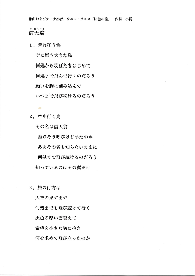 友人の小貫さんが、ウニャ・ラモスのケーナ曲「灰色の瞳」に、新しい詩となる「信天翁・あほうどり」を作詞してくれた。