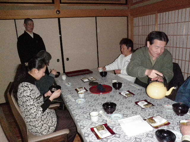 終了後は、寿明和尚様にご挨拶をして、書院でおかゆを頂く。部屋の中は、テーブルも温かくなっている。