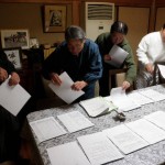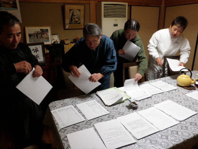 昨年一年間は、参加者が持ち回りで、般若心経の見解発表を行ってきた。その資料を冊子にするため、一同でページ組を行う。
