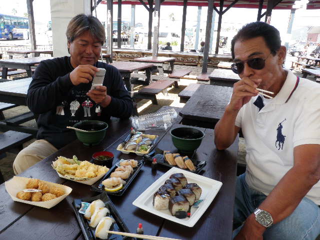 昼食は黒潮市場のお寿司だ。揚げたての天ぷらも買って、3人でたらふく食べた。