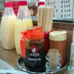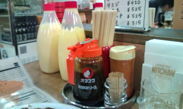 カキそば焼きを頼んだ。テーブルを見ると、大きなマヨネーズのチューブが並んでいる。隣を見ると、お好み焼きにたっぷりとかけている。
