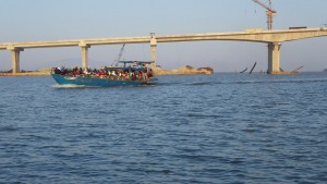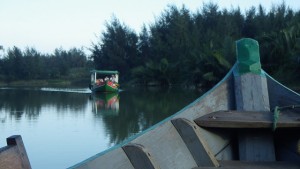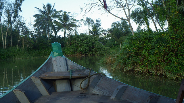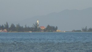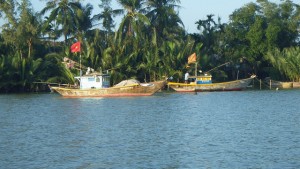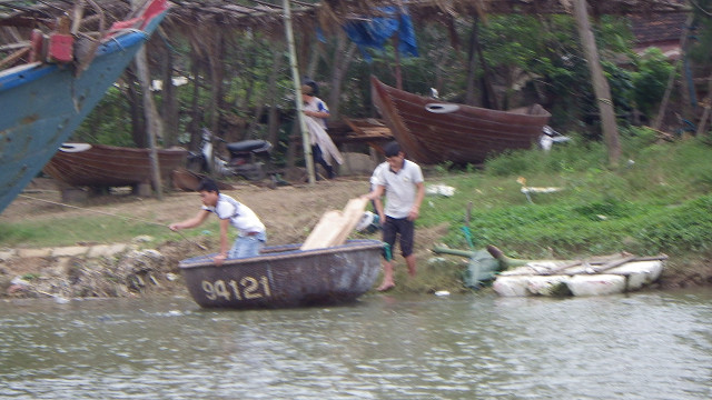 次の日は小型船をチャーターして、河口まで連れていってもらうことにした。シングルプランキングの木造艇だ。エンジンは横型のディーゼルだ。クランクを手動で回せば、一発でかかる。デルタの河口は日本の河川とは水流が全く異なる。川の流れはないかのごとくだ。むしろ潮汐による潮流の影響のほうが強い。上げ潮流を避けるためか、小型船は本流を避けて、脇の水路を4ノットほどで河口へ向けて下っていく。建設中の河口を跨ぐ巨大な橋を越えると、うねりが入ってきだした。ホイアンへの目印である灯台が河口の洲の中ほどに見える。