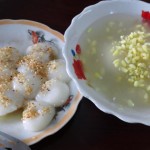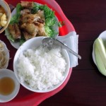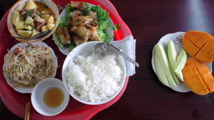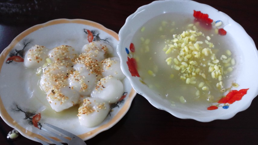 工場ではお昼前にデザートタイムだ。甘い白玉の中に、黒砂糖のあんが入っている。お昼は工場の専属コックが、運んできてくれた。デザートのマンゴーは、トアさんがむいてくれた。