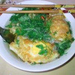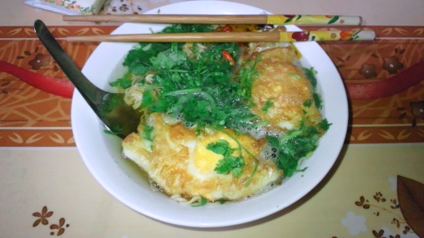 朝食を食べに、宿の一階にある食堂へ行く。テーブルの鉢には、チキンラーメンに目玉焼きが二個のっている。薬味はパクチだ。