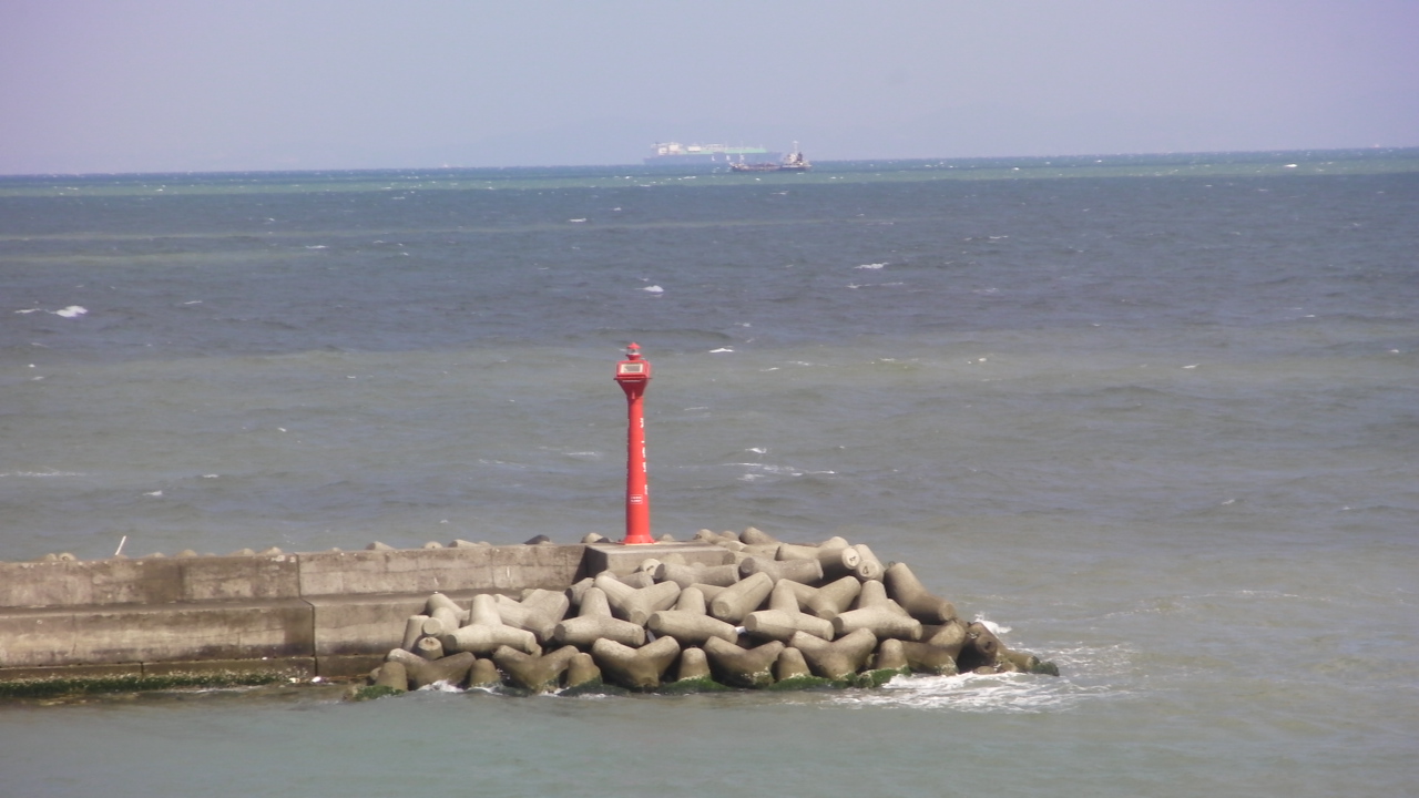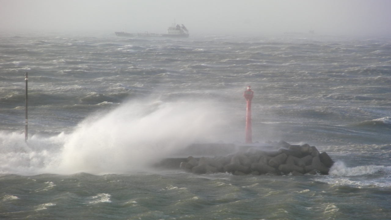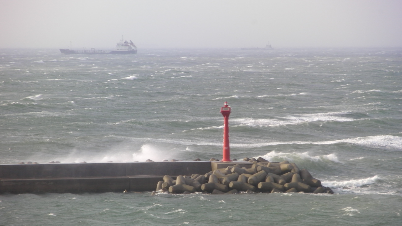 泉州沖に避泊している貨物船は、30隻余りとなった。寒冷前線が通過した15時頃からは、風向が西に変化し、さらに吹き出した。リーショアの風となったために、泉州沿岸は波が高くなる。錨泊している貨物船は大きくピッチングを繰り返している。アンカーチェーンは大丈夫だろうか、人ごとながら心配だ。大波が前の防波堤を越え始めた。赤い灯台もしぶきにかすむ。
