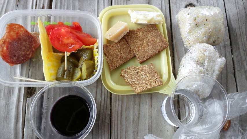 ベンチへ座り、ランチだ。 Napaで買ってきた赤ワインを持ってきた。チーズもある。玄米のおにぎりも食べて満足だ。水平線は、ボーとかすんでいる。頭もボーとしてきた。