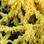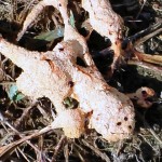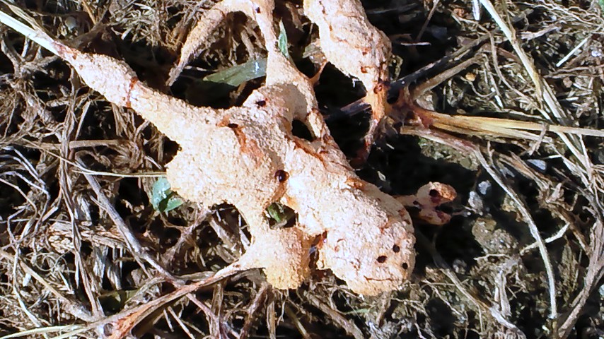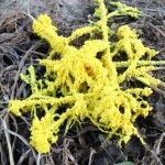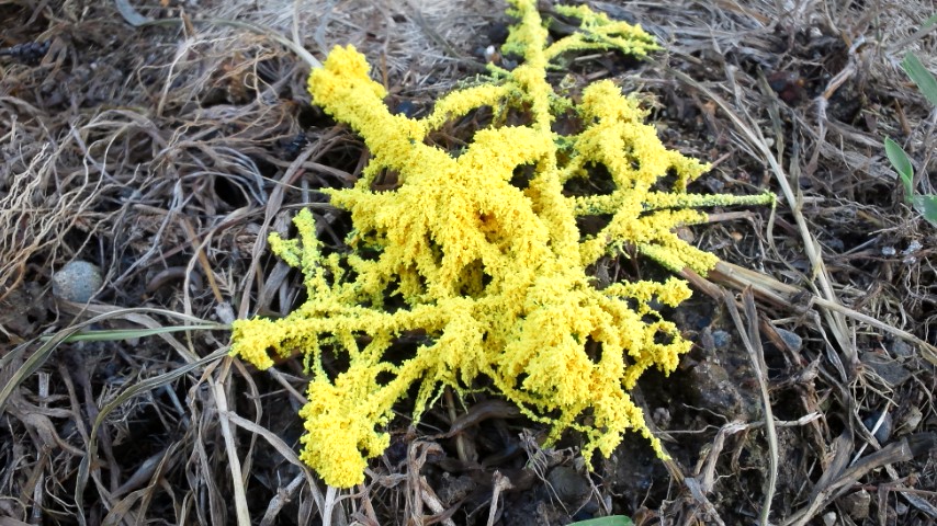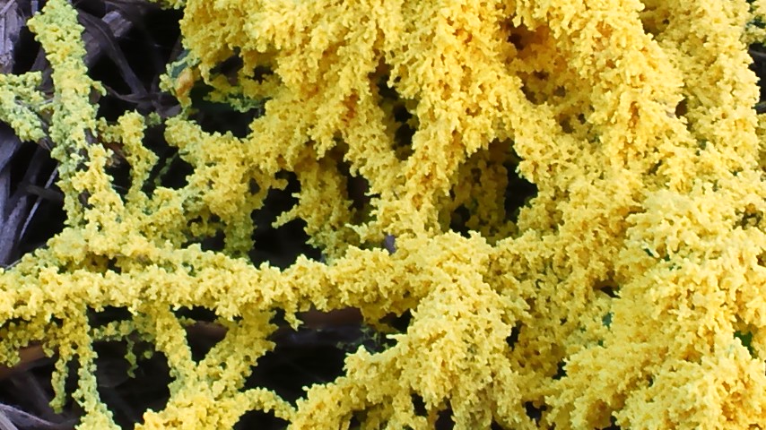 黄色い蛍光色だ、あれは何だ?帰宅して窓からのぞいて驚いた。抜いた雑草をまとめている場所の表面へ、ヒトデ型に広がっている。近くで見ても、なんだかわからない。植物なのか、茸の一種なのか、カビなのか、実に気持ち悪い生物だ。