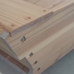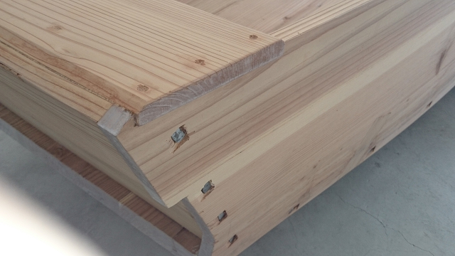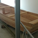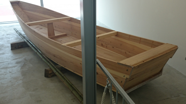 一階には木造の小舟が展示されている。5mほどの小舟は、保津川のあゆ舟を復原したものらしい。舟はアメリカ人の船大工、ダグラス・ブルックスさんが、見習いの日本人とともに建造したとのことだ。建造中のビデオが館内で放映されているので、構造や工法がよくわかる。工法は和船と同じく、船釘を使ったはぎ合わせとなっている。平底なのは川を航行するので、喫水を浅くする必要があったためだろう。