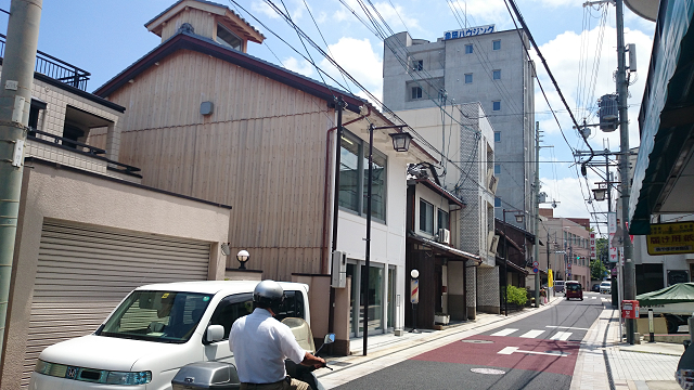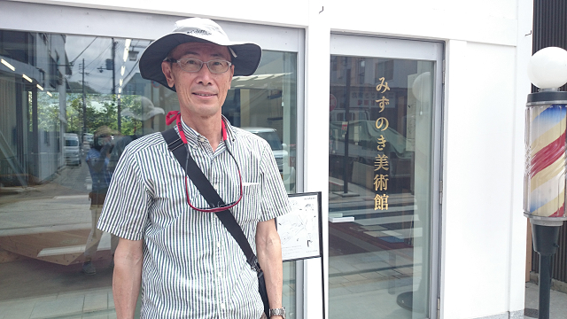 旅館を出た後、すぐ近くのみずのき美術館を訪問した。商店街をゆっくりと通るが、どこに美術館があるのかわからない。パーキングに止めて、歩いて探しに行く。商店街の散髪屋のとなりに、控えめな看板を見つけた。隣の民家らしい建物に、みずのき美術館と書いてある。