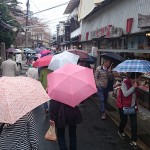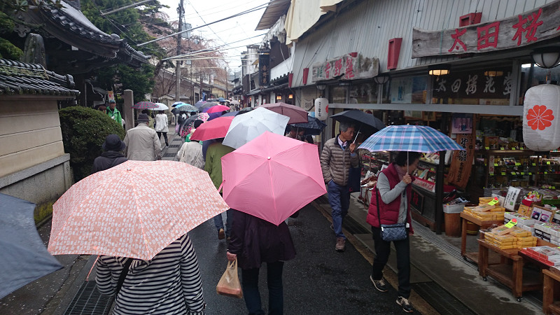 吉野山は冷たい雨だった。しかし沿道は、肩を触れ合うほど込み合っている。3時間の滞在であったが、試食と試飲だけで十分満足となった。西行庵へ行くのは次の機会にする。