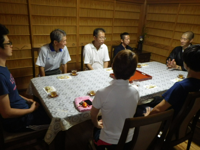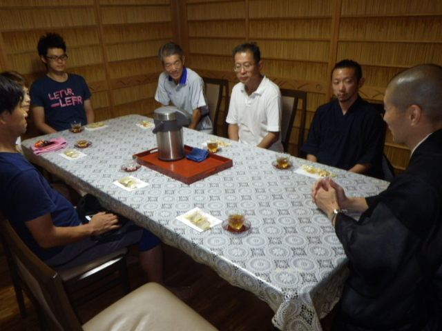 書院に移り、南寿明和尚様と一緒に懇談する。初めての参加者が居られたので、一人ずつ自己紹介し、自分の考えを述べる。リラックス、リセット、仏弟子と、それぞれに違うので、面白い。