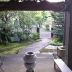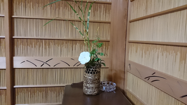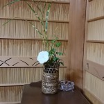 無事に終了して書院へ移ると、机の上には冷たいお茶が用意されている。お菓子は大きなくるみ餅だ。よく冷えている。お茶もお菓子も、和尚様が自ら用意していただいているようだ。ありがたく平らげる。坐禅も、その後のお茶飲み話も楽しみだ。書院の花は涼しげだ。白のむくげに矢筈ススキと金水引が添えられている。