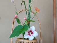 宗全籠に入った夏の花、路地にはギボウシ