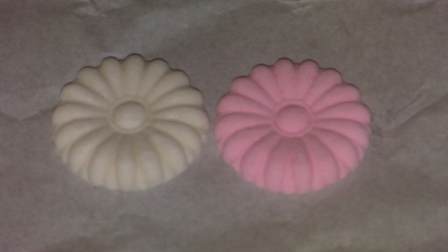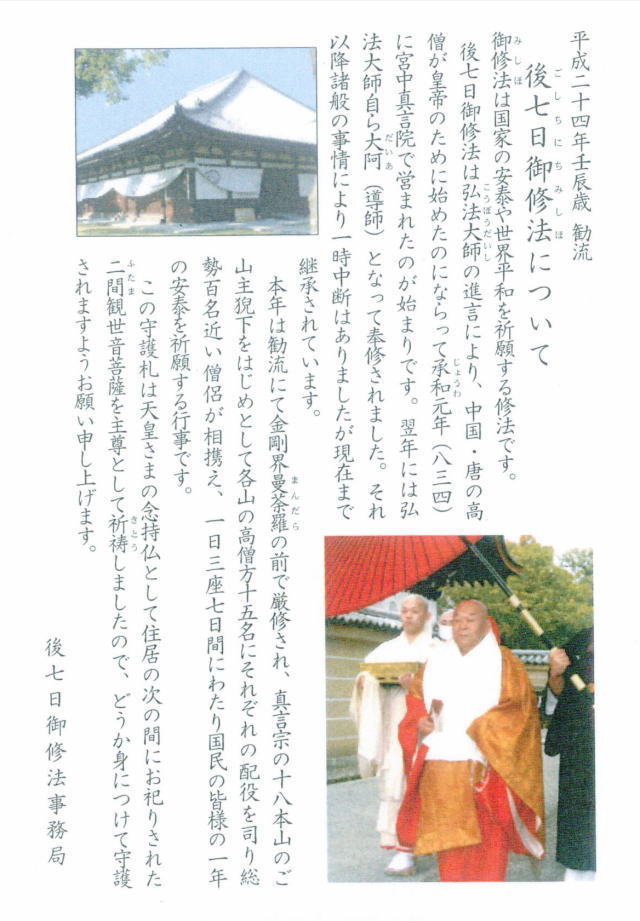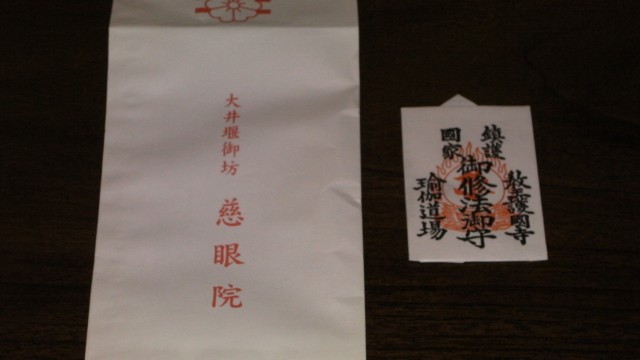 慈眼院の袋を開くと、お守りと紅白の押し菓子が入っている。「このお守りは後七日御修法で祈祷したものですよ、もらってくださいね。」