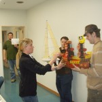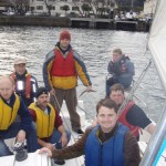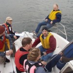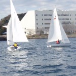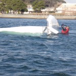 厳寒の中でディンギー(小型ヨット)をチン(転覆)させ、復元するテストも行います。1隻はチンしたまま沖合に流されました。候補生はラダーにしがみついて、艇からは離れません。ところがマリーナの救助ボートも、エンジントラブルを起こし、アンカーを打って立ち往生です。