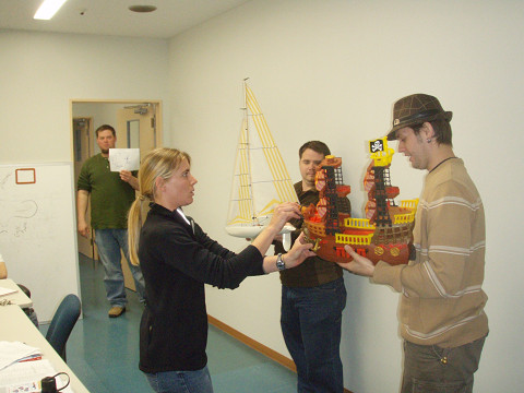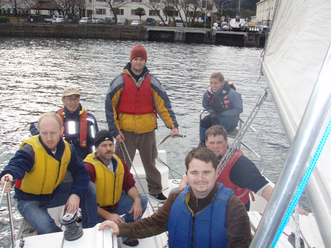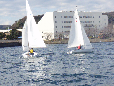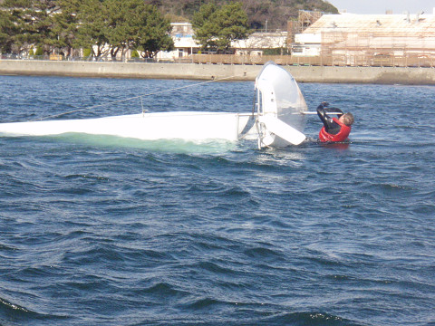 厳寒の中でディンギー(小型ヨット)をチン(転覆)させ、復元するテストも行います。1隻はチンしたまま沖合に流されました。候補生はラダーにしがみついて、艇からは離れません。ところがマリーナの救助ボートも、エンジントラブルを起こし、アンカーを打って立ち往生です。