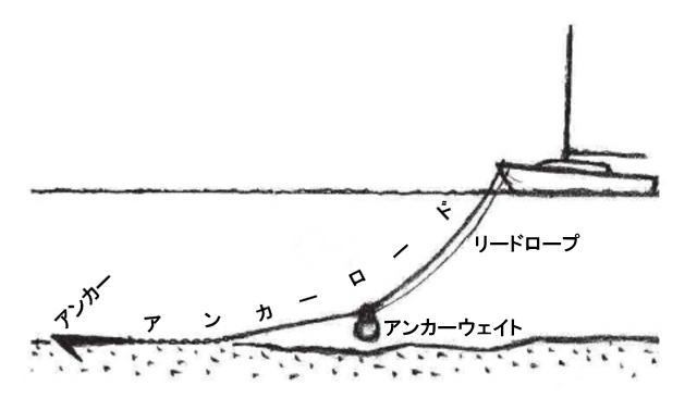 アンカーリングの手順20の後に、狭い港内などでアンカーロードの上を他船が航行する恐れがあるときは、アンカーウェイトを設置すること。